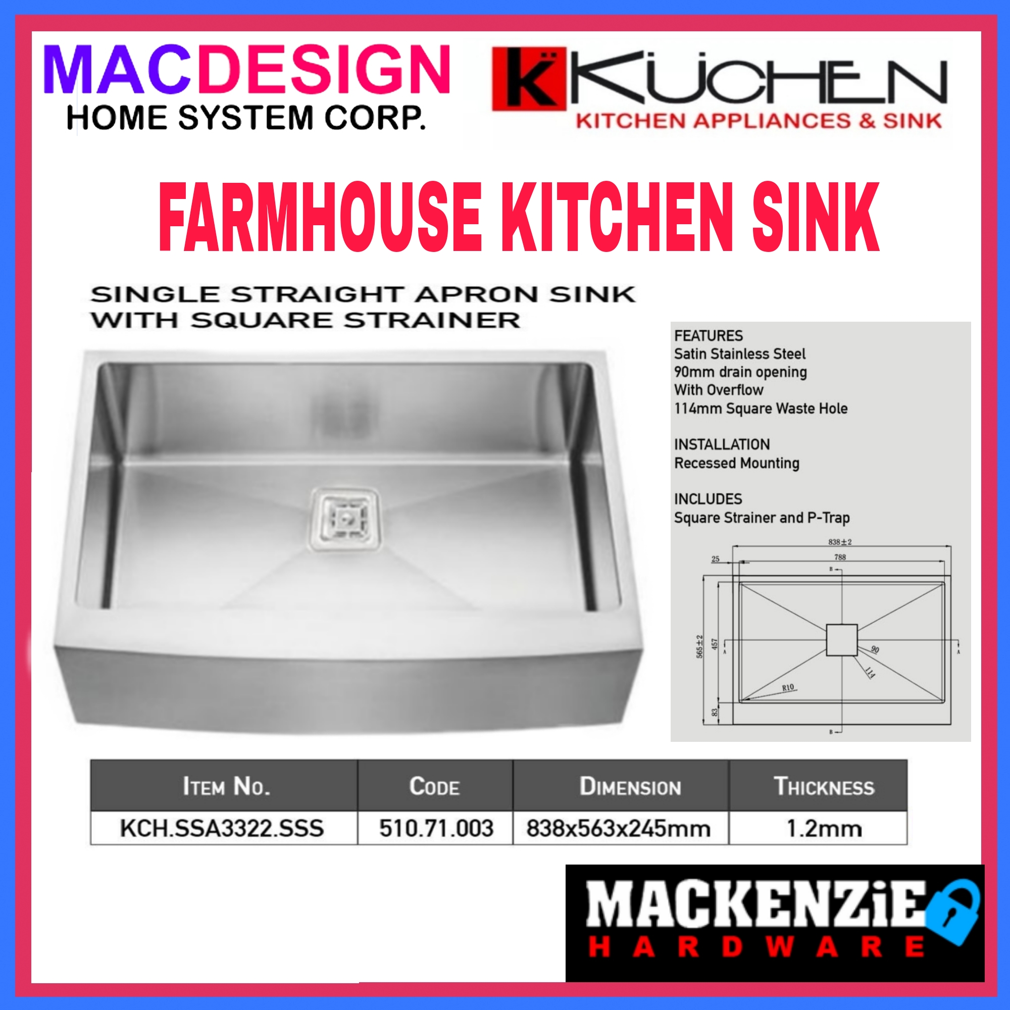 Kuchen Farmhouse Single Straight Apron Sink With Square Drain Strainer Sus304 Satin Stainless Steel Lazada Ph