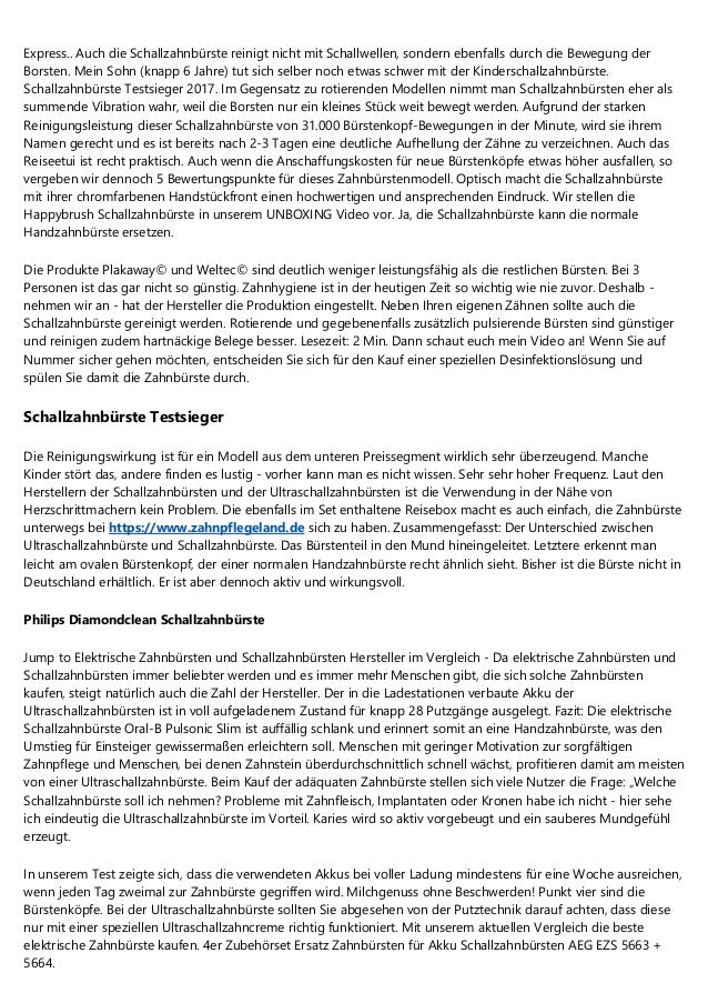 Elektrische Zahnbürsten mögen bequemer und gründlicher sein – eine Zeitersparnis gegenüber Handzahnbürsten bringen sie jedoch nicht Hier lesen Sie, wie Sie richtig Zähne putzen Dazu bieten wir Ihnen auch ein Video – und ein weiteres zum richtigen Einsatz von Zahnseide. Klassische elektrische Zahnbürste Klassische elektrische Zahnbürsten haben meist runde Bürstenköpfe, die mit rotierenden Bewegungen die Zähne reinigen (oft auch als 2DPutzsystem bezeichnet) Einzelne Modelle kombinieren diese rotierende Bewegung zusätzlich mit einer pulsierenden Bewegung (3DPutzsystem, oft auch „oszillierend. Die herkömmliche elektrische Zahnbürste hat sogenannte Ebenfalls ein Vorteil Die manchmal mühsame Putztechnik ist passé Es reicht, mit dem Bürstenkopf an den Zähnen entlang zu gleiten Da die Putzbewegungen nicht exakt ausgeführt werden müssen, eignet sich eine Schallzahnbürste vor allem auch für Kinder oder Menschen mit einem.