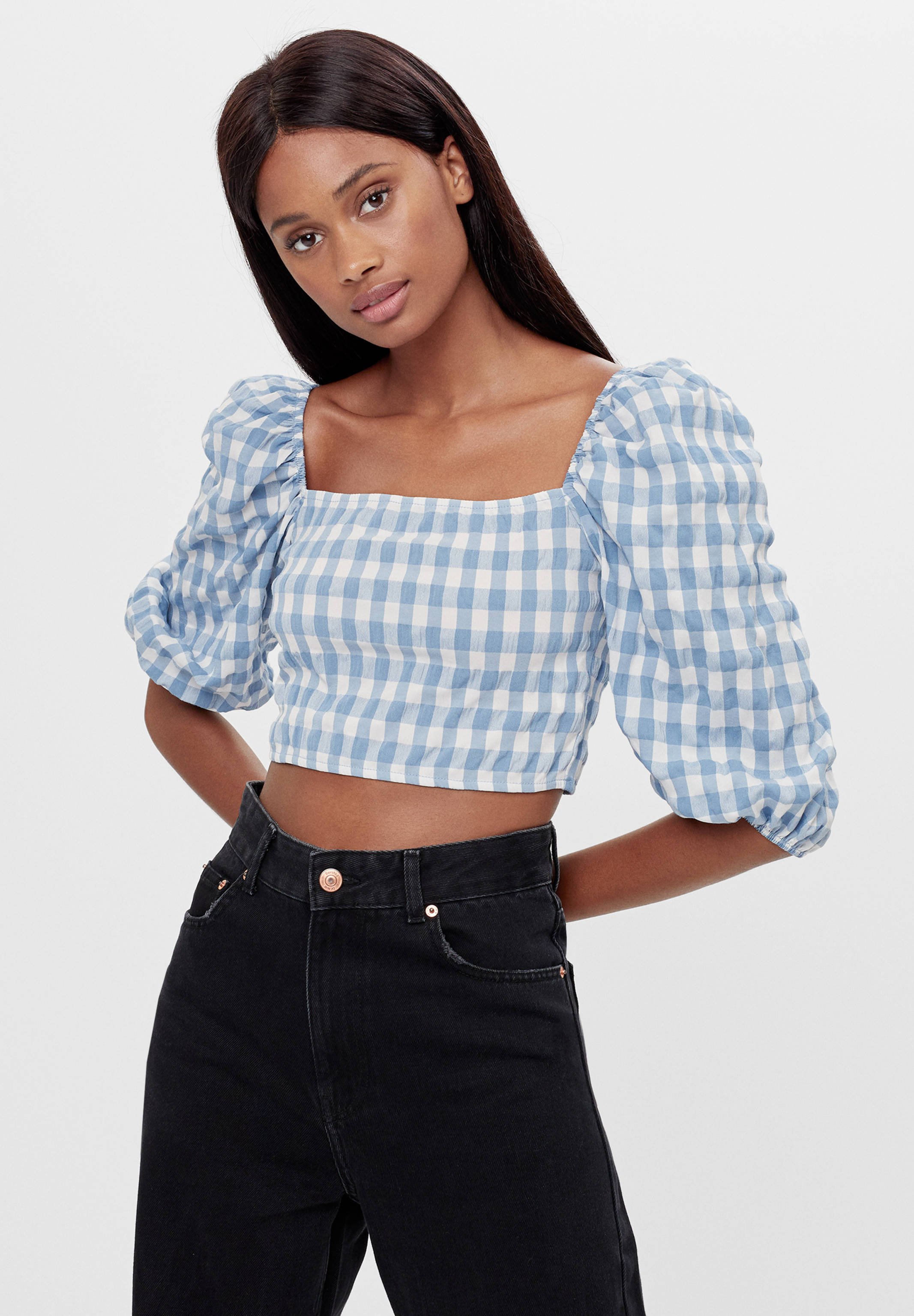 Bershka Kastenausschnitt Und Puffarmeln Bluse Blue Zalando De