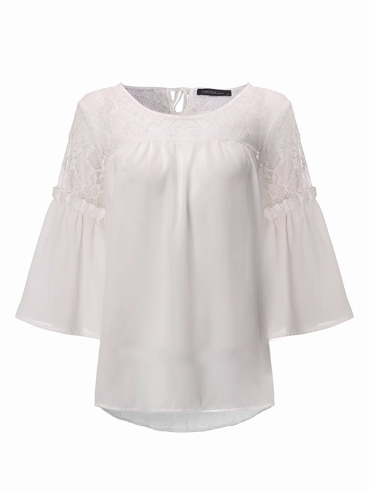 Weiss Splicing Spitze Stickerei Ruckenfreies 3 4 Armel Mode Chiffon Bluse Damen Oberteile Blusen Oberteile