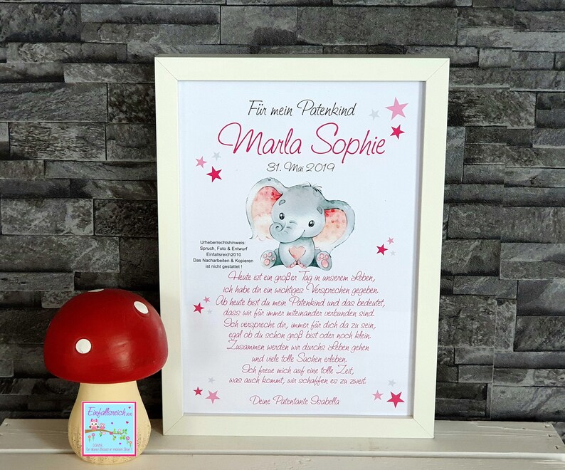 Trotz der Tatsache, dass diese Bewertungen nicht selten verfälscht sein können, bringen die Bewertungen ganz allgemein eine gute Orientierungshilfe. Der Patenbrief ist ein Versprechen des Paten an das Patenkind "Ich werde immer für dich da sein" Der Patenbrief kann auch schön gerahmt werden und wird somit zu einem persönlichen Geschenk für das Patenkind Der Patenbrief wird individuell mit dem Namen eures Kindes und dem Namen des Paten für euch gestaltet. Suche für mein Patenkind einen schönen Taufspruch den ich vorm Altar vorlesen soll!.