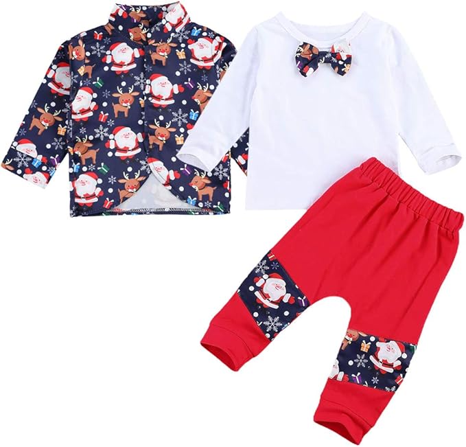 Sauglings Baby Junge Outfits 3stucke Weiss T Shirt Top Gentleman Anzug Langarm Bowknot Shirt Santa Druck Mantel Jacke Rote Hose Weihnachten Babykleidung Outfits Set Amazon De Bekleidung