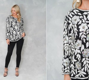Vintage 80s Schwarz Weiss Glam Bluse Oberteil Silber Pailletten Perlen L Xl Ebay