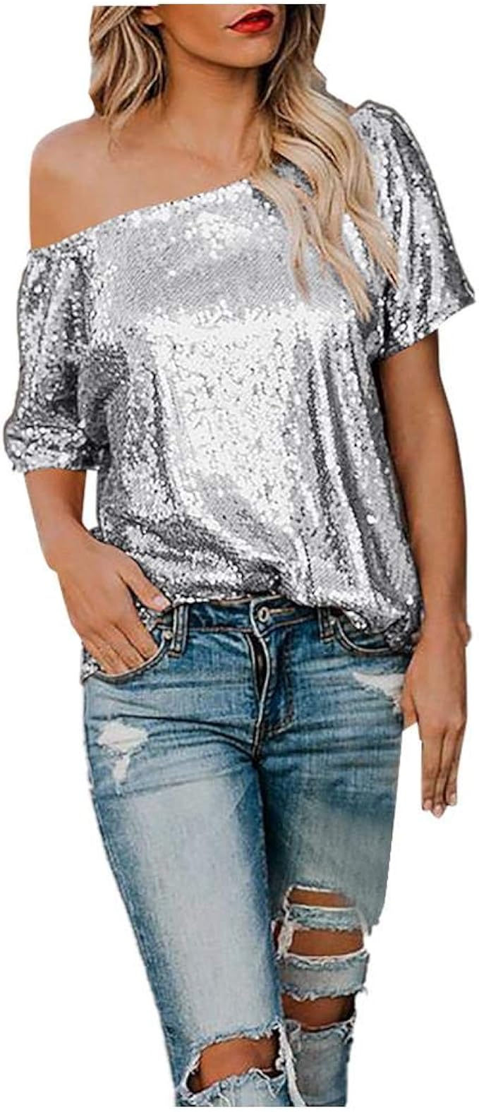 Silber Pailletten Glitzer One Shoulder Rundhals Halblanger Schone T Shirt Damen Mode Top T Shirts Oberteile