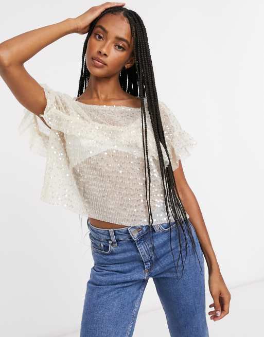 Only Transparentes Pailletten Oberteil Mit Ruschen In Gebrochenem Weiss Evesham Nj