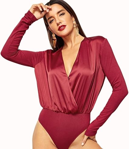 Jjhr Bodysuit Solide Wrap Plunge Neck Langarm Elegante Satin Body Frauen Korper Buro Damen Bodys Amazon De Sport Freizeit
