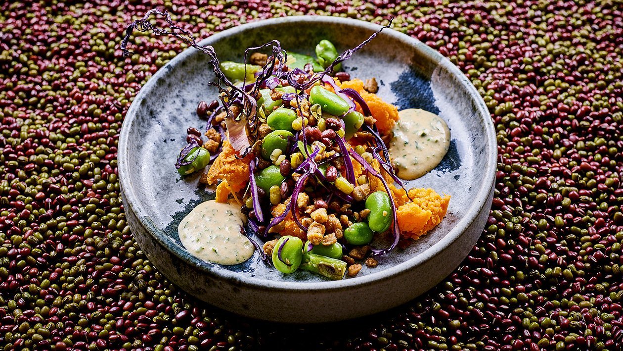 Gestampfte Susskartoffel Mit Chilibohnen Und Senf Krautersauce