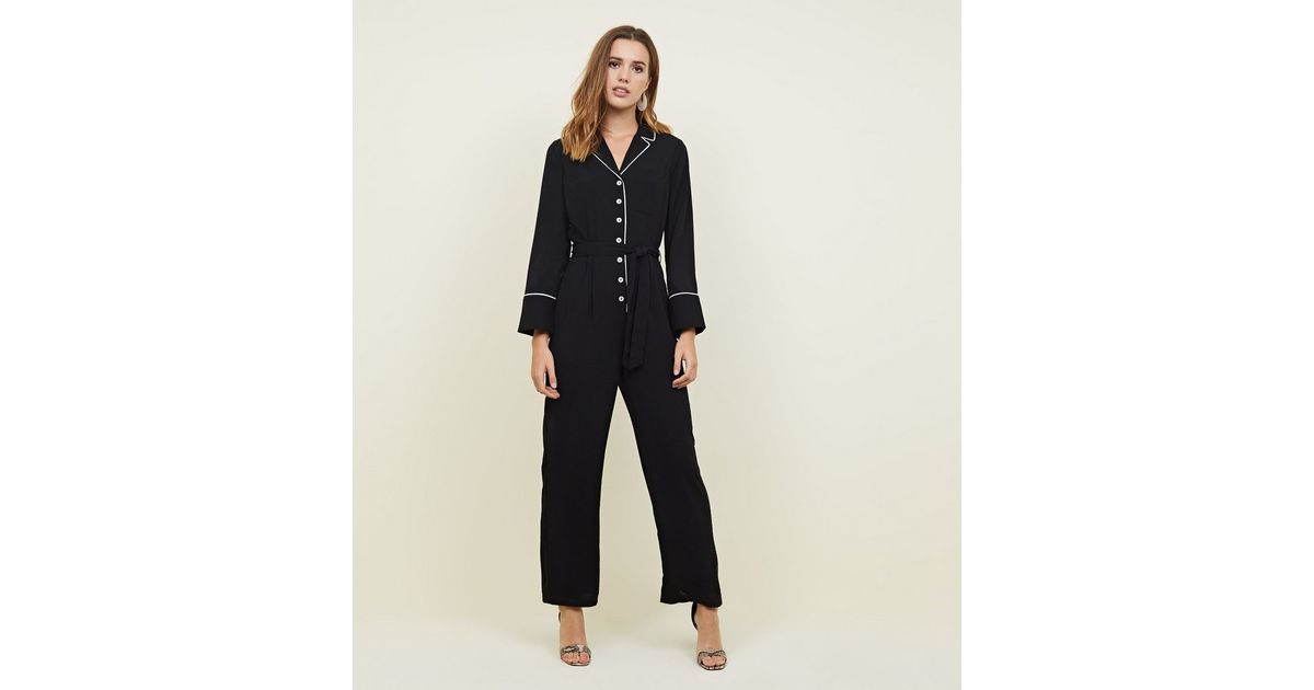 Schwarzer Langarmliger Jumpsuit Mit Gurtel Und Farblich Abgesetzten Details New Look