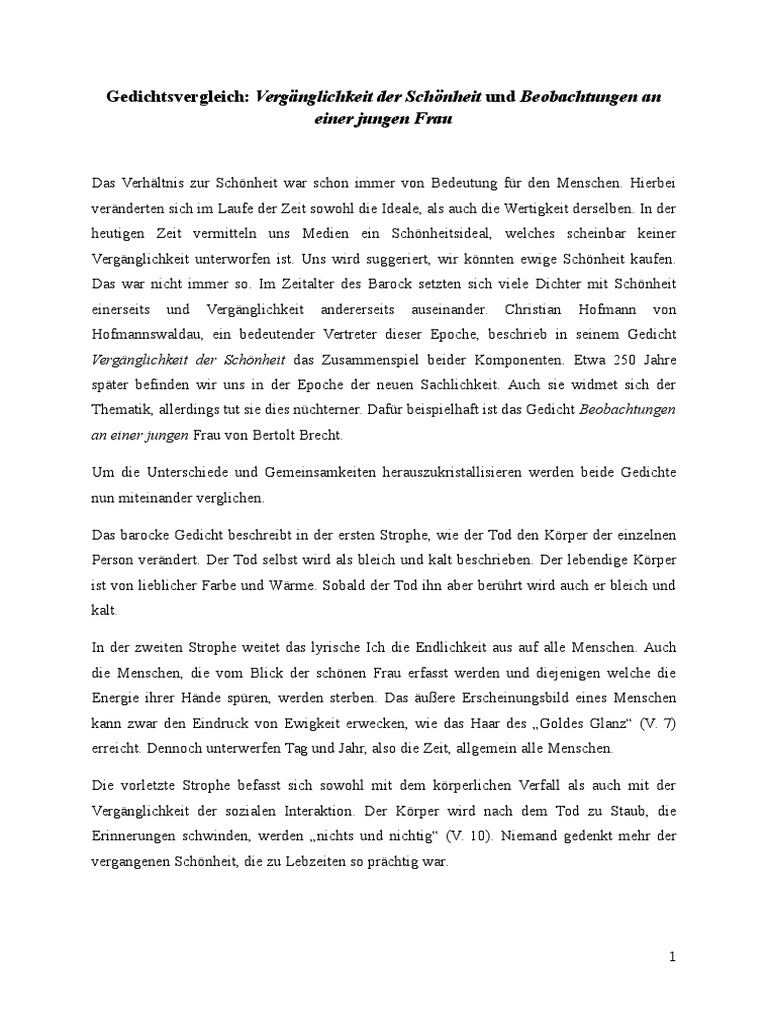 Gedichtsvergleich Verganglichkeit Der Schonheit Und Beobachtungen An Einer Jungen Frau