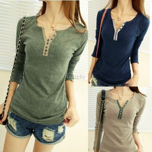 Damen V Ausschnitt Langarm Knopfe Bluse T Shirt Hemd Pullover Pulli Shirts Tee Ebay
