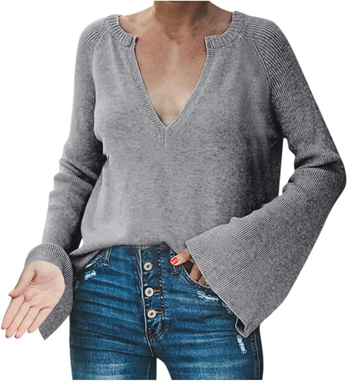 Allence Strickpullover Damen Pullover V Ausschnitt Langarm Einfarbig Shirt Oberteile Hemd Sweatshirt Tops Loose Pulli Bluse Khaki Schwarz Grau Amazon De Bekleidung