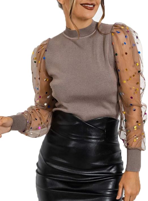 Damen Bluse Mit Bunten Punkten Kontrastierend Durchsichtig Netzstoff Puffarmelig Rippenstrick Slim Fit Gr X Large Braun Amazon De Bekleidung