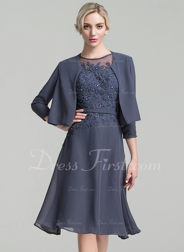 A Linie U Ausschnitt Knielang Chiffon Kleid Fur Die Brautmutter Mit Ruschen Applikationen Spitze Dressfirst