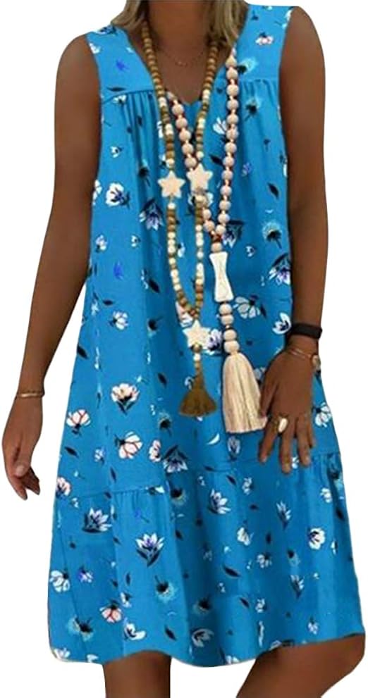 Damen Sommer Kleid Armellos Drucken Kleid A Linie Knielang Trend 21