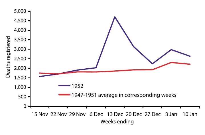 In December 1952, London experienced a catastrophe As depicted in the Netflix series The Crown (which last year aired on Chinese streaming sites) the disaster seemingly came out of nowhere, as sunny blue skies suddenly gave way to a choking, blinding, fog that enveloped the city and was more severe than anything many had seen before Lack of visibility brought normal life to a halt, with. A 10 report to the UK Parliament found that in 08 4,000 people died in London from air pollution (the same number from the Great Smog of 1952) and 30,000 died across the whole of the UK. A London bus makes its way along Fleet Street in heavy smog, 6th December 1952 (Photo by Edward Miller/Keystone/Hulton Archive/Getty Images) A woman leads a car through London’s Regent’s Park with a torch, during the thick fog with visibility reduced to a few yards.