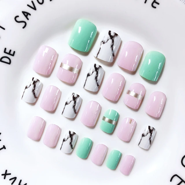24pcs Marble Fake Nails White Pink Blue Artificial False Nails Matte Acryl Nagel Tips Fashion Stiletto False Nails Pointed Sharp False Nails Aliexpress