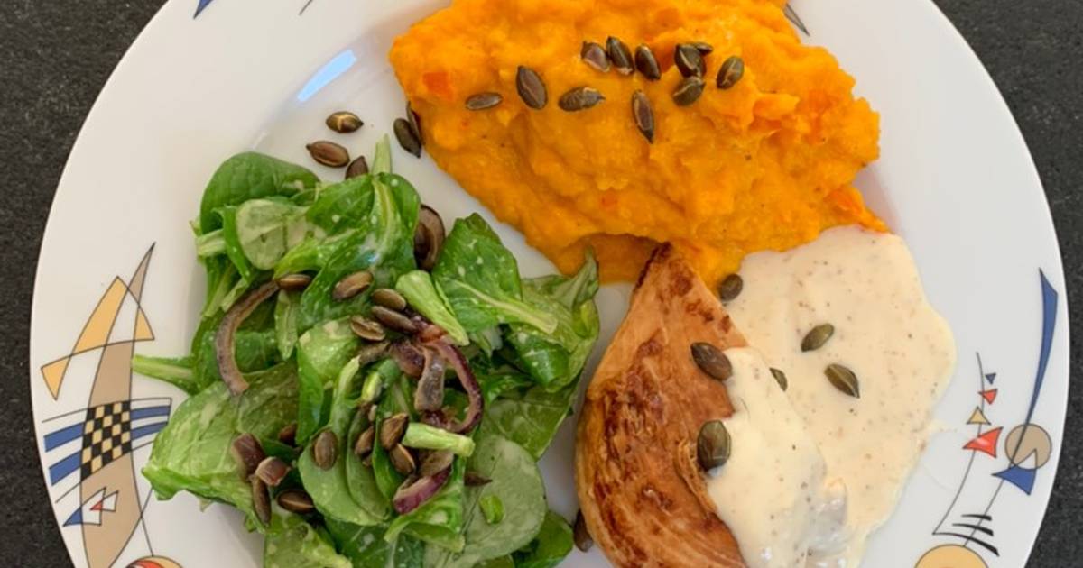 Honig Senf Hahnchen Mit Kurbispuree Und Feldsalat Rezept Von Didodance Cookpad