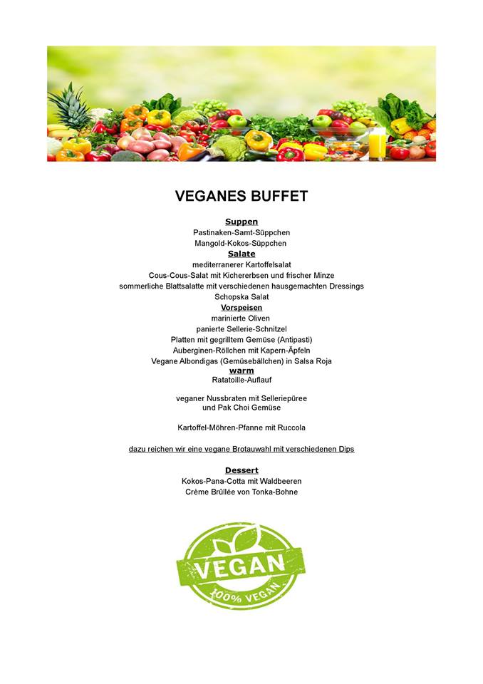 Tipp Planen Sie ein Buffet, können Sie dieses in einen veganen und nichtveganen Bereich unterteilen. Kaltes & warmes Buffet Als Liebhaber feiner Esskultur und kulinarischer Köstlichkeiten stehen Ihnen anlässlich Ihrer Veranstaltung vielfältige Möglichkeiten zur Verfügung Für jede Festlichkeit fertigen wir nach Ihren individuellen Wünschen kalte und warme Buffets. Kontakt 030 / veganes Buffet Veganes Buffet veganes Buffet Suppen BlumenkohlCurrySüppchen oder ApfelSellerieSüppchen Vorspeisen kalt BlumenkohlWings mit zweierlei Dips grüner CousCosSalat mit Pistazien und Aprikosen.