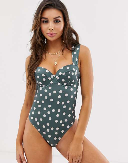 Asos Design Gepunkteter Badeanzug Mit Korbchen Und Bugeln In Khaki Asos