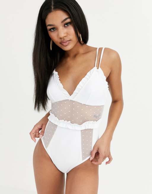Asos Design Fuller Bust Weisser Badeanzug Mit Korbchen Bugel Und Netzstoff Oberlage Asos