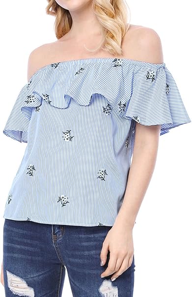 Allegra K Damen Sommer Volant Blumen Streifen Off Shoulder Top Bluse Amazon De Bekleidung